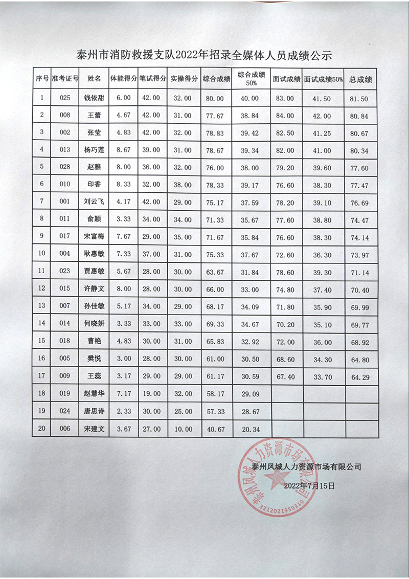 泰州市消防救援支隊2022年招錄全媒體人員成績公示