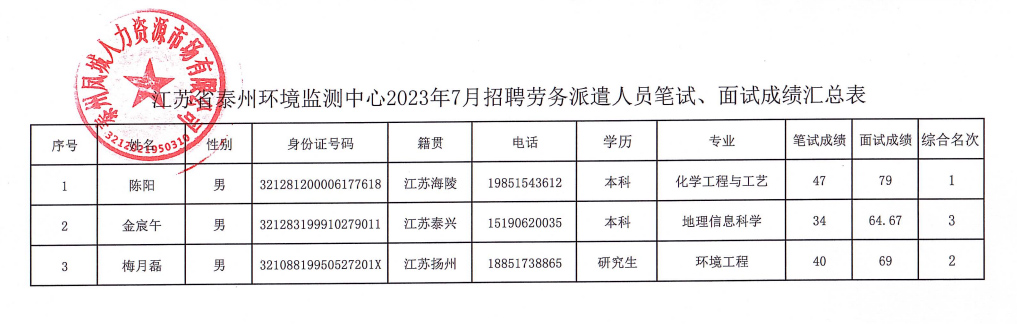 泰州市環(huán)境監(jiān)測(cè)中心招聘成績(jī)公示
