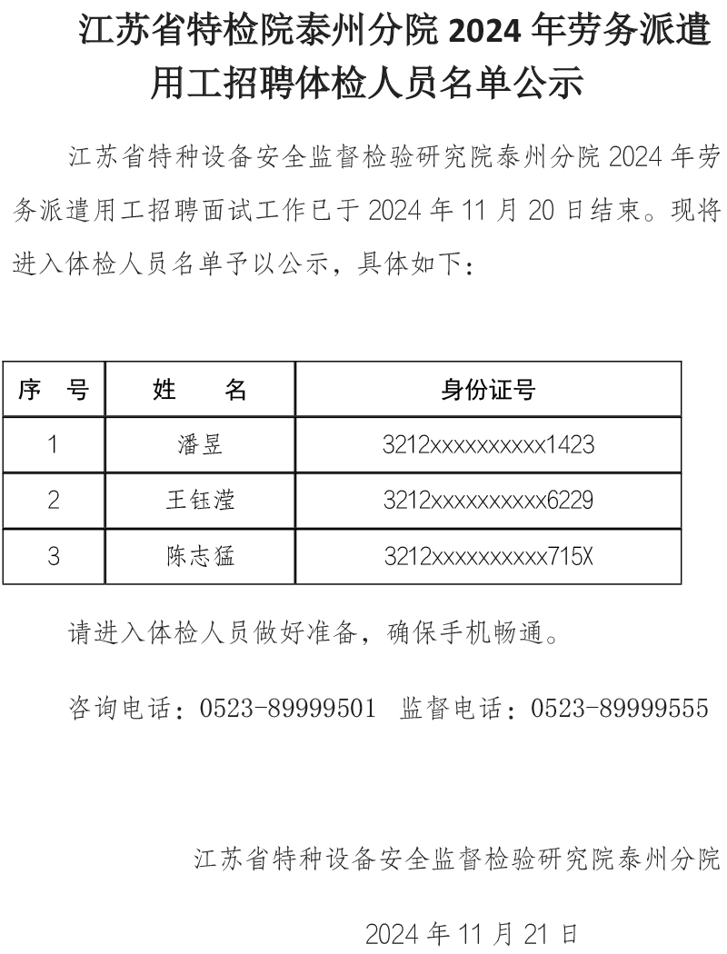 江蘇省特檢院泰州分院2024年勞務(wù)派遣用工招聘體檢人員名單公示