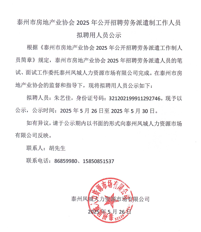 泰州市房地產業協會2025年公開招聘勞務派遣制工作人員 擬聘用人員公示